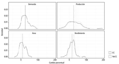 El número de observaciones por categoría es: demanda con cambio climático (CC) = 1125; demanda sin cambio climático (NoCC) = 125; producción con cambio climático (CC) = 873; producción sin cambio climático (NoCC) = 97; área con cambio climático (CC) = 873; área sin cambio climático (NoCC) = 97; rendimiento con cambio climático (CCL873; rendimiento sin cambio climático (NoCC) = 97.