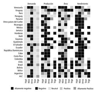 Dados los cambios hasta tanto proyectados de los crecimientos de los rendimientos y las áreas cultivadas, el crecimiento de la producción de los cultivos analizados envolvería diversas transformaciones respecto al escenario carente de cambio climático (NoCC). Específicamente, se encuentra que el crecimiento de la producción de maíz y frijol caería en países como Nicaragua, El Salvador, Guatemala y Honduras, en donde actualmente más de un millón de pequeños agricultores siembra estos cultivos y el consumo es mayor a 25 kg por persona (Schmidt, Eitzinger, Sonder y Sain, 2012), y en países de la región Andina como Colombia y Venezuela.
