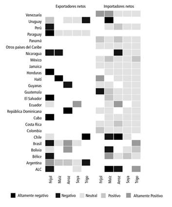 Gráfico 5 Perfil de impacto del cambio climático para las exportaciones netas por países y cultivos (exportadores netos e importadores netos)