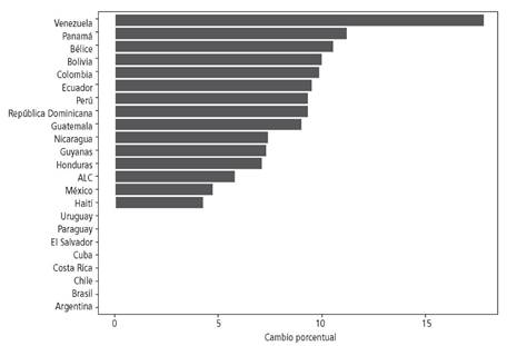 Entre los países en donde se presentarían los mayores incrementos en este indicador de inseguridad alimentaria se encuentran Venezuela (17.8 %), Colombia (9.8 %), Perú (9.4 %), Bolivia (10 %), y Ecuador (9.5 %) en la región Andina, y Panamá (11.2 %), Belice (10.5 %), República Dominicana (9.3 %), Guatemala (9 %), Nicaragua (7.3 %), Honduras (7 %) y Haití (4.3 %) en Centro América y el Caribe, y México (4.7 %). Es importante destacar que en el modelo Impact el cálculo del porcentaje de la población en riesgo de padecer hambre tiene una asíntota que se acerca al 4 %. Este resultado busca reflejar la idea de que los aumentos de la disponibilidad de alimentos solo pueden mejorar la situación de seguridad alimentaria hasta un punto limitado, y que los efectos positivos que pueden observarse en la reducción de inseguridad alimentara gracias a los incrementos en la disponibilidad de alimentos son decrecientes (Robinson et al., 2015).