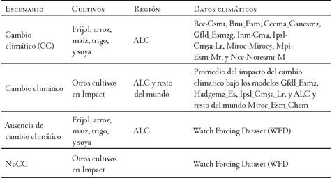 Ante todo, los rendimientos utilizados en este estudio provienen de dos fuentes de información. Primero, para el caso de los cultivos de arroz, trigo, maíz, soya y frijol, se emplean los rendimientos de estos cultivos simulados en nueve escenarios de cambio climático y en un escenario sin cambio climático (ver tabla 1). Dichos resultados fueron desarrollados en el marco del proyecto Climate change vulnerability in the agricultural sector in Latin America and the Caribbean, el cual fue desarrollado en el Centro Internacional de Agricultura Tropical. En el trabajo de Gourdji et al. (2016) se presenta una explicación detallada del proceso de modelación de los cultivos aquí analizados. En segundo lugar, para los demás cultivos presentes en el modelo Impact, este estudio se beneficia de la última versión de los impactos del cambio climático presentes en dicho modelo; resultados que fueron desarrollados en el marco del proyecto Global Futures & Strategic Foresight. Así pues, en el estudio de Robinson et al. (2015) se presenta una descripción de la metodología desarrollada en este último caso.