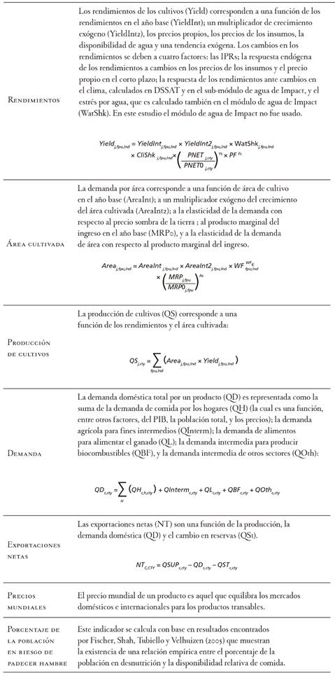 En las secciones siguientes se presentan las evaluaciones realizadas. Todos los datos presentados a partir de ahora son resultados del modelo Impact, o bien corresponden a cálculos realizados a partir de ellos. Entre las variables analizadas del modelo Impact se encuentran los rendimientos, el área cultivada, la producción, la demanda, las exportaciones netas, los precios mundiales, y el porcentaje de la población en riesgo de padecer hambre. En la tabla 2 se presenta una explicación de cada una de las variables analizadas y de sus ecuaciones.