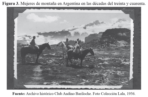 Las imágenes de estas mujeres reiteran el ideal que reconociéramos en las revistas chilenas: jóvenes deportistas, pertenecientes a sectores medios y altos, muchas veces familiares de los directivos del CAB, resultan en los modelos de la actividad de montaña que se buscaba propiciar, que también se van a encontrar en las imágenes idealizadas de las guías de turismo. En la figura 3. la imagen de archivo del CAB da cuenta de estas mujeres-viriles-económicamente independientes, pero guiadas en su libertad por varones: