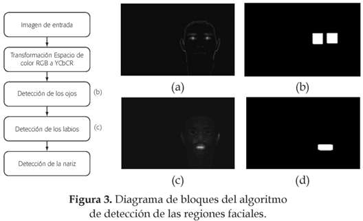 En la figura 3 se puede observar el diagrama de bloques del algoritmo de detección de las regiones faciales y las imágenes que resultan luego de la aplicación de las ecuaciones para el realce de los objetos faciales. Como se indicó, es necesario realizar operaciones adicionales para lograr aislar los objetos del rostro del resto de la imagen y poder construir una máscara binaria de la región correspondiente.