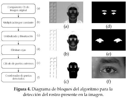 Como se puede ver en la figura 1 (a), para el ojo están definidos tres puntos, (endocantion, exocantion y pupila). Hasta el momento el algoritmo ha calculado una máscara que asegura que dentro de ella se encuentran los ojos. Esto quiere decir que los ojos no tienen delineadas sus fronteras en una representación binaria. Por lo tanto, se realiza el siguiente procedimiento para lograr definir una estructura correspondiente a los ojos del individuo similar a la que aparece en la figura 4 (e). Se emplea una multiplicación sobre el plano de crominancia Cb, dado que este resalta la región ocular, por una constante igual a 2.4. El valor indicado se estableció por medio de pruebas en las que se observó que los valores de Cb, correspondientes al fondo de la imagen y a los ojos consiguen ser más blancos (se enfatizan); mientras que los valores correspondientes a la piel del rostro se mantienen iguales (se atenúan). Posteriormente se realiza un umbralizado adaptativo para binarizar la región.