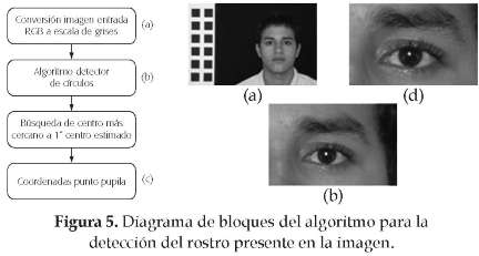 Para la localización del punto pupila primero se ubica el iris del ojo, que por su forma circular se halla por medio de un algoritmo detector de círculos sobre toda la imagen en escala de grises. En este caso se aplica la transformada circular de Hough [22] , [23] , [24] , [25] . Como la pupila se encuentra en el centro del iris, sus coordenadas pueden ser halladas calculando el centro del círculo detectado [26] , [27] , [28] , [29] . El iris se establece realizando una búsqueda del centro del círculo más cercano al centro de masa de los objetos hallados para establecer los cantiones [figura 4 (e)] . Este punto se elige como el punto pupila.