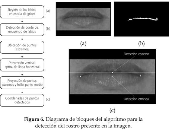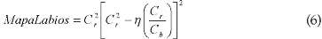Para lograr detectar esta región se parte del siguiente hecho: la región de los labios contiene valores altos de crominancia roja y valores bajos de crominancia azul en comparación con las demás regiones faciales dentro del espacio YCbCr. Además, los labios tienen una respuesta relativamente baja a la característica Cr/Cb pero una respuesta alta a C} [17] . Por esto, la diferencia entre C} y Cr/Cb se utiliza para enfatizar la región de los labios. Las ecuaciones 6 y 7 recopilan las consideraciones anteriores y se muestran a continuación [4] :