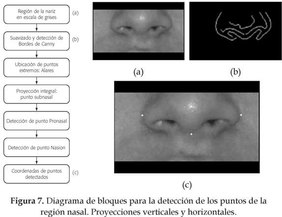 para hallar las fronteras de la nariz y se buscan los puntos extremos (alares) sobre el eje horizontal, ver figura 7 (b).