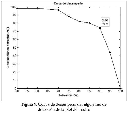 La figura 9 muestra la curva de desempeño obtenida. Se puede observar que para un porcentaje de tolerancia entre el 85 y 90% se obtuvo un porcentaje de clasificaciones correctas entre 75 y 80%. El porcentaje de tolerancia obtenido indica que la cantidad de imágenes utilizadas para el entrenamiento del modelo gaussiano es adecuada y que permite obtener un grado de precisión satisfactorio en la segmentación de la piel.
