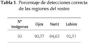 Según los datos en la tabla 1, el porcentaje de detecciones correctas de la región nasal es igual a 84.62%. Sin embargo, es bajo si se compara con los resultados obtenidos para las regiones de los ojos y labios. Pero lo cierto es que este porcentaje pone de manifiesto que la atinada detección de la región nasal depende de la estimación correcta de las regiones de ojos y de la boca en la misma imagen.