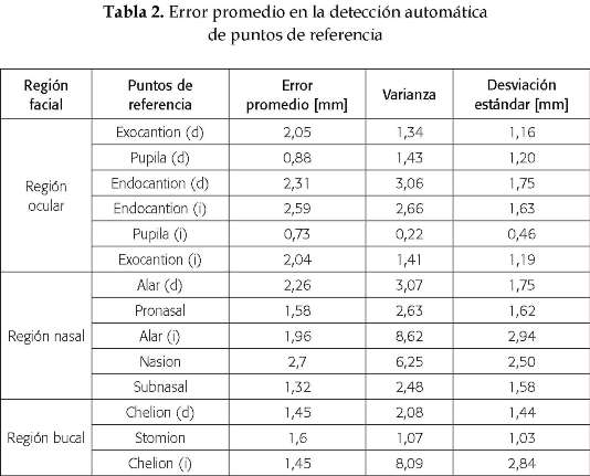 Los resultados obtenidos se pueden ver en la tabla 2. Con base en los datos se puede afirmar que el valor promedio del error cometido en la ubicación automática de los puntos de referencia, se encuentra dentro de un rango aceptable (menor o igual a 3 milímetros) y que los datos cuentan con una desviación o dispersión respecto de la media aritmética aceptable según lo indica la columna de la desviación estándar. También se pueden notar en los datos las variaciones en las condiciones de iluminación sobre el rostro de los individuos durante las sesiones de adquisición. Se puede decir que la mitad derecha del rostro del individuo recibió en promedio una mejor iluminación que la mitad izquierda. Sin embargo, esta desviación en las condiciones de iluminación no es drástica en la medida en que no ubica al error por fuera del rango de error establecido [33] .