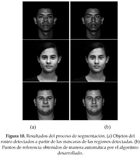 Como parte de los resultados del algoritmo se muestra la figura 9. En esta se pueden observar las regiones del rostro detectadas figura 10 (a); además, en la figura 10 (b) se pueden ver la totalidad de los puntos de referencia detectados automáticamente.