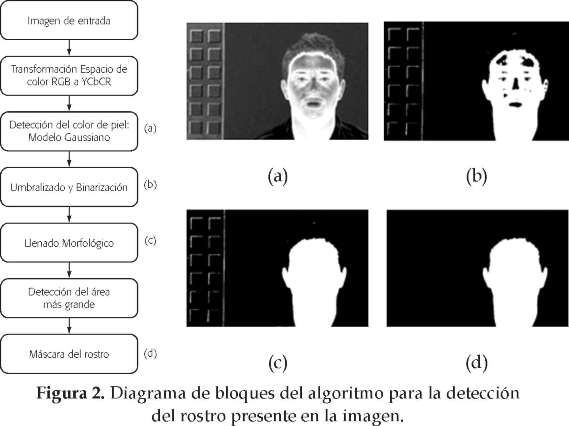 Donde λ es la distancia de Mahalanobis definida como indica la ecuación 2. Los vectores, µ = [ µCb, µCr] vector de la media, y A, la matriz de la covarianza, son estimados a partir de un conjunto de entrenamiento [6] , [11] , [12] , [13] , [14] . En la figura 2 se muestra el diagrama de bloques del algoritmo para la detección de la región facial y a modo de ejemplo se muestran las imágenes que se obtienen en cada etapa del mismo.