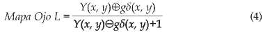 El algoritmo de detección de los ojos utiliza las operaciones de dilatación y erosión en escala de gris con elementos estructurantes circulares. Estas operaciones son aplicadas independientemente sobre la componente de la luminancia y de la crominancia para construir el mapa de los ojos. La construcción del mapa de los ojos en la componente de la luminancia se basa en la característica de que la región de los ojos contiene tanto píxeles oscuros como claros. Entonces, se combinan operadores morfológicos para enfatizar dichos píxeles [15] , [16] . El mapa de los ojos en la componente de la crominancia es construido a partir de la componente Cb, la inversa de Cr y la razón Cb/Cr. Los dos mapas resultantes para los ojos son combinados por medio de una operación de multiplicación lógica AND [10] . Las consideraciones anteriores pueden ser compactadas por medio de las ecuaciones 3, 4 y 5 [4] .