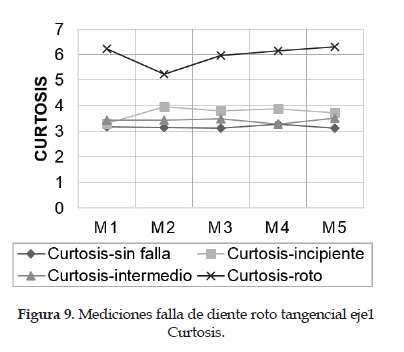 Basado en los resultados de la matriz anova y del análisis Duncan para el indicador Curtosis, se obtiene que la mejor medición y la más significativa es en la dirección tangencial, en el eje 1 y en un nivel de severidad grave, ya que éste presentóun incremento del 88% en su valor, ver Figuras 9 y 10. Sin embargo, las fluctuaciones que se presentan no lo hacen un factor estadísticamente confiable para la detección específica de este tipo de fallas. El valor de Curtosis presentóun decremento en su magnitud con el aumento de la severidad del 25% al 50% de pérdida del diente.