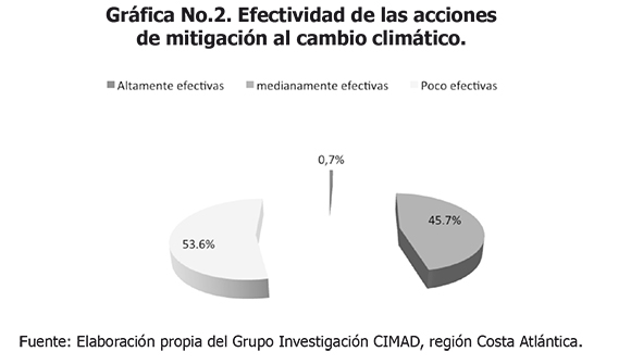 Sobre la efectividad de las acciones promovidas en las diferentes localidades de la Costa Atlántica para la mitigación del cambio climático, se obtuvieron los siguientes resultados: altamente efectivas: 0,7%, medianamente efectivas 45,7% y poco efectivas: 53,6%. Lo anterior demuestra que, en su gran mayoría, estas acciones han sido poco o medianamente efectivas. Se cree que estos resultados obtenidos se deben a los siguientes aspectos: