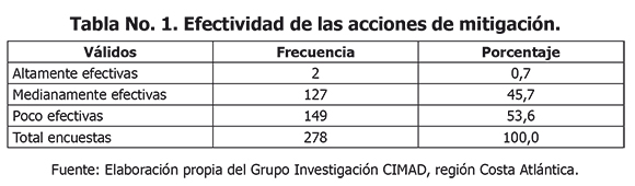 En relación con la efectividad de las acciones de mitigación emprendidas en la Región Costa Atlántica, las encuestas arrojan la siguiente información: