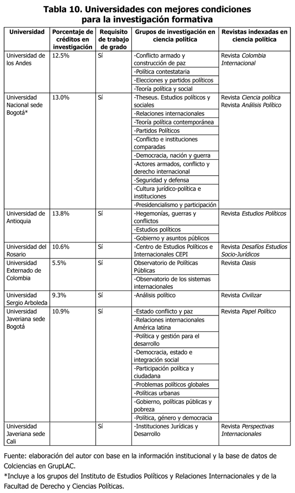 (1) Planes de estudio con mayor énfasis y mejores condiciones institucionales para la investigación formativa. En ellos entre 10-15% de los créditos corresponden a asignaturas de investigación, cuentan con trabajos de grado como requisito u opción de grado, tienen grupos de investigación reconocidos por el sistema nacional y revistas indexadas. Se trata de las instituciones con mayor desarrollo académico en el campo de la ciencia política. En este grupo entran seis universidades privadas (Universidades de los Andes, Pontificia Universidad Javeriana sedes Bogotá y Cali, Externado de Colombia, Sergio Arboleda y del Rosario) y dos públicas (Universidades Nacional y de Antioquia) (ver Tabla 10).
