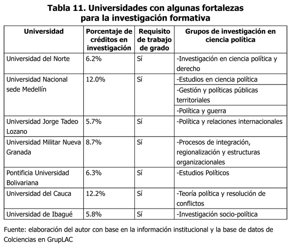 Las dos universidades públicas que mejores condiciones institucionales presentan para la investigación formativa son la Nacional y la de Antioquia. En la Universidad Nacional se conjuga la capacidad institucional en investigación de un alto número de profesores con doctorado, diez grupos de investigación adscritos a la Facultad de Derecho, Ciencias Políticas o al Instituto de Estudios Políticos y Relaciones Internacionales y dos revistas indexadas en el sistema nacional. En su plan de estudios se asigna uno de los mayores porcentajes de créditos a asignaturas de investigación y los estudiantes deben elaborar un trabajo de grado en la modalidad de monografía, acompañada por una asignatura adicional semestral del mismo nombre. La monografía debe tener la extensión de un artículo para revista especializada (treinta páginas). Los estudiantes tienen la opción de realizar una pasantía durante un semestre en alguna institución pública o privada, la cual reemplaza al trabajo de grado (Universidad Nacional, 2007).