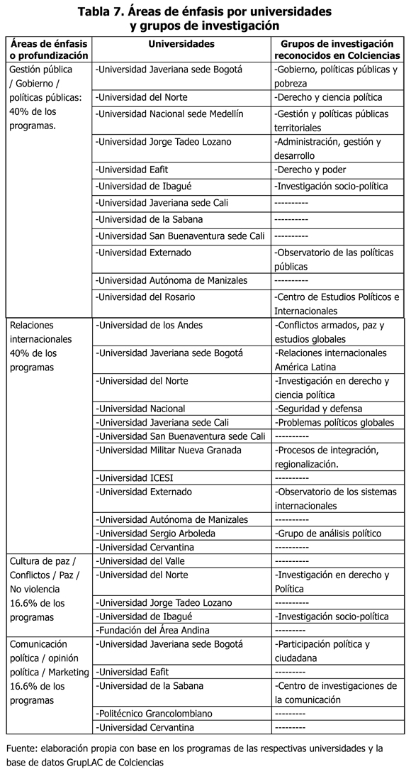 De igual forma, aunque hay énfasis que están relacionados con las especificidades de la sociedad colombiana, especialmente los referidos al conflicto, la paz y la convivencia, otros son de carácter más general como las políticas públicas, las relaciones internacionales, la opinión pública y marketing. Asimismo, actualmente hay un imperativo respecto a la formación universitaria orientada hacia la investigación, lo cual se refleja en los contenidos metodológicos y en los propósitos formativos de los planes de estudio.