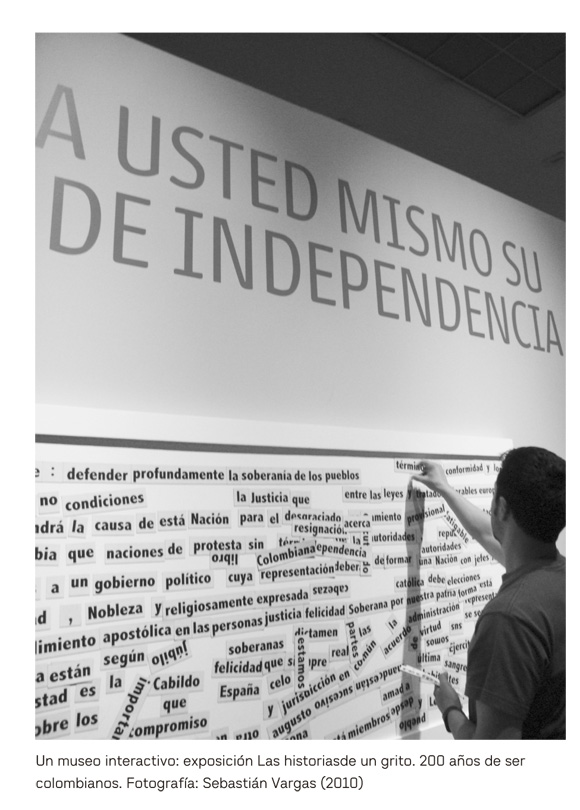 El Ministerio de Cultura también participó de la conmemoración del bicentenario a través de su red de museos. El Museo Colonial inauguró en agosto de 2010 su nueva sala permanente, "Identidades en juego antes de la independencia",mientras que el Museo de la Independencia-Casa del Florero llevó a cabo un proyecto de renovación integral que transformó su colección en términos museográficos y museológicos. Quiero concentrarme en la exposición del Museo Nacional,"Las historias de un grito. 200 años de ser colombianos", que estuvo abierta al público entre julio de 2010 y enero de 2011. Esta propuesta se alejó de una visión alegórica o celebratoria del bicentenario y fue planteada en términos críticos tanto historiográfica como políticamente. El guión museográfico se concentró en plantearle al visitante una serie de cuestionamientos sobre los lugares comunes y las verdades dadas por estables en la historia de nuestro país. Esto fue posible porque la exposición no abordó como tal el proceso histórico-empírico de la independencia, sino que se enfocó en las representaciones de dicho proceso, en las maneras como durante doscientos años diversos actores (casi siempre las élites políticas y culturales) narraron los acontecimientos que permitieron el nacimiento del estado nación moderno en Colombia. La exposición se centró no tanto en "lo que pasó" sino en "cómo se contó lo que pasó":