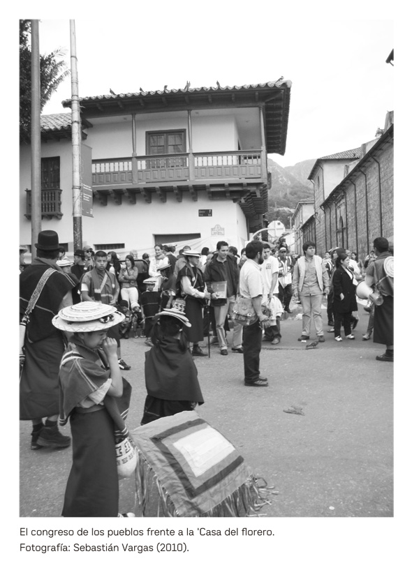 Otra de las grandes movilizaciones alternativas durante el bicentenario fue El Congreso de los pueblos. Se trató de una convocatoria similar a la Marcha Patriótica, pero se distanciaba de esta en el sentido en que no rescataba la idea de patria. Convocado también por una articulación de movimientos sociales (sectores populares, juveniles, indígenas, anarquistas, campesinos, urbanos, etc.), el Congreso se llevó a cabo el 19 de julio en la Plaza de San Victorino, lo cual tuvo un enorme peso simbólico, en la medida en que este fue uno de los sectores desde donde se inició la movilización popular que permitió a los notables criollos de Bogotá presionar al virrey Amar y Borbón para instituir la junta suprema de gobierno el 20 de julio de 1810 31. Los organizadores del Congreso de los Pueblos se encargaron de recordar la importancia del lugar (y el por qué su escogencia como punto de partida no fue arbitraria) a la vez que conmemoraron figuras marginales del relato patrio como José María Carbonell. Esto demuestra la capacidad de diferentes grupos y sectores sociales subalternos o alternativos de intervenir en el terreno de las políticas de la memoria con sus propios relatos, versiones y posiciones.