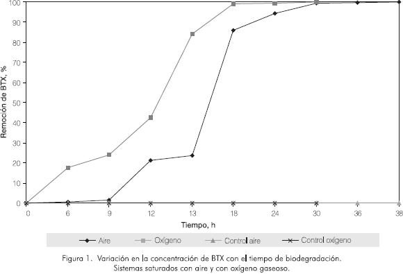 Al evaluar el proceso de biodegradación de BTX en medios saturados con oxígeno gaseoso (OD = 40 g·m-3) y con aire libre de CO2 (O.D. = 8,08 g·m-3) se observó mayor velocidad de biodegradación en el primer caso. En el sistema de biodegradación saturado con oxígeno gaseoso se alcanzó un porcentaje de biodegradación del 99% en 30 horas, mientras que en el sistema saturado con aire fueron necesarias 38 horas. Como se aprecia en la Figura 1, los sistemas presentaron remociones del 99,5% a las 24 h y 30 h, respectivamente.