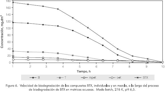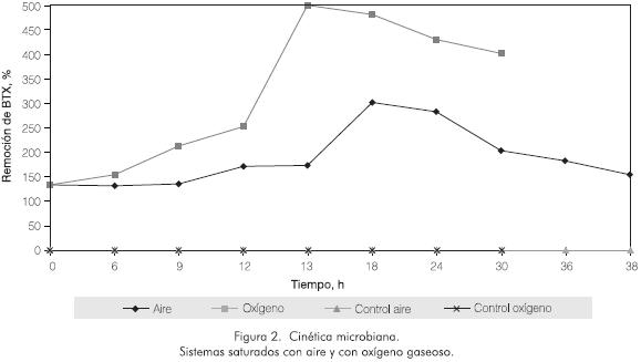Pasadas las 13 h y 18 h en los sistemas saturados con oxígeno gaseoso y aire, respectivamente, se observó la etapa de declive en el cultivo microbiano, manifestada por la disminución progresiva de los valores de ufc·10-6 m-3. Esto sugiere que en estos momentos los microorganismos no sólo han suspendido su crecimiento, sino que han empezado a morir. Este último fenómeno puede ser causado por la ausencia de sustrato en el medio ya que, como se comentó anteriormente, en esos tiempos de reacción la concentración de BTX ha bajado notablemente (remociones cercanas al 90% en ambos casos). En los respectivos controles no se observó variación en la concentración de BTX, lo cual indica que la oxidación del proceso es netamente biológica.