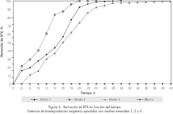 El estudio del proceso de biodegradación en los tres medios de cultivo formulados (medios 1, 2 y 3) se llevó a cabo saturando el medio de reacción con oxígeno gaseoso. Los resultados indican que los microorganismos tienen capacidad para remover más del 90% de los BTX presentes en concentraciones de 60 g·m-3 , en un tiempo aproximado de 22 h. Sin embargo, tal como se ilustra en la Figura 3, el mejor comportamiento bacteriano se observó en el medio 2. En el sistema conformado con este medio se presentó la máxima velocidad de biodegradación (4,14 g·m-3 ·h-1) y se alcanzó remoción de BTX del 83% en 14 h, disminuyéndose la carga de contaminante hasta 10,8 g·m-3 , límite exigido por la EPA para vertimientos industriales. Transcurridas 18 h de proceso se observó una remoción del 95,7%, y una concentración mínima remanente durante 6 h, al final de las cuales se presentó una remoción del 100% (Figura 3).