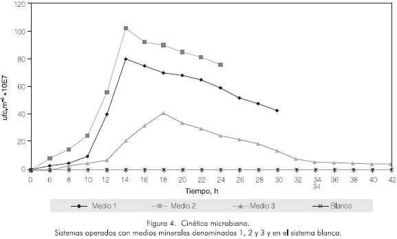 Los sistemas de reacción con medio mineral 1 y 2 mostraron la misma tendencia de degradación, con velocidades máximas de degradación muy similares (Figura 3). Sin embargo, presentaron marcadas diferencias en los tiempos de remoción total, requiriéndose 30 h y 38 h, respectivamente. Este fenómeno se puede explicar con base en el crecimiento bacteriano como se aprecia en la Figura 4. Los microorganismos cultivados en el medio 3 presentaron una fase de latencia de 6 h, mientras que los microorganismos cultivados en los medios 1 y 2 empezaron su fase exponencial desde el tiempo cero.