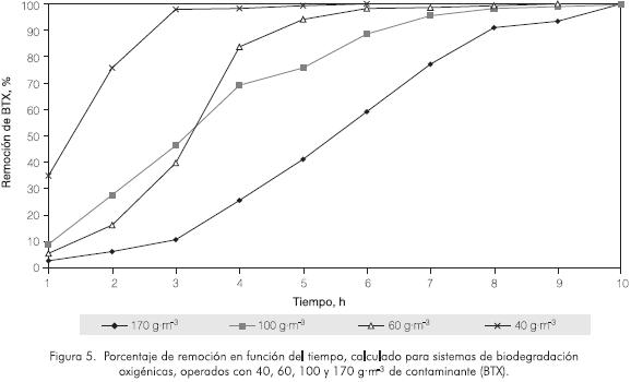Este comportamiento es corroborado por los valores de unidades formadoras de colonia (ufc·m-6), medidos a lo largo del proceso de biodegradación para los cuatro sistemas evaluados (40, 60, 100 y 170 g·m-3 ), los cuales revelan que las altas cargas de contaminante no inhiben el crecimiento bacteriano y los títulos microbianos se mantienen hasta que el sustrato aromático se consume.