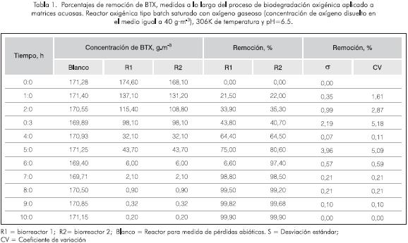 En la Tabla 1 se reportan las concentraciones, los porcentajes y las velocidades de remoción de BTX a lo largo de la biodegradación, tanto para los biorreactores como para el control. Como se observa, los valores de desviación estándar están por debajo de 4 y los coeficientes de variación no superan el 5%, lo que muestra la veracidad del proceso.