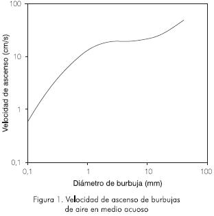 En operaciones de transferencia de masa "gas-líquido", frecuentemente utilizadas en procesos de tratamiento de aguas residuales, el aumento del área interfacial es uno de los parámetros más importantes para aumentar la eficiencia en la operación. En el caso de la flotación, la uniformidad y continuidad del proceso están ligadas al diámetro de burbujas colocadas en la fase líquida. Esto se mejora si hay presencia de microburbujas pues el incremento de su densidad numérica y el aumento del tiempo de residencia elevan la probabilidad de colisión y adhesión del sistema partícula/burbuja (Gochin). Como se observa en la Figura 1, burbujas de diámetros menores a 100 mm tienen velocidad de ascenso de algunos milímetros por segundo, mientras que burbujas de algunos milímetros de diámetro (2 a 9 mm) tienen velocidades 10 a 30 veces superiores.