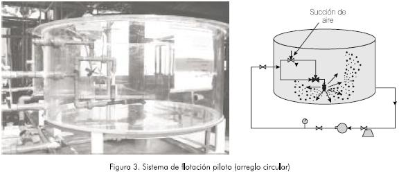 La boquilla principal es la que maneja la mayor parte del flujo de agua y la que descarga la totalidad de la mezcla agua - aire, al fondo de la celda. La boquilla secundaria se encarga de succionar el aire y hacer una primera formación de burbujas. Estas pasan por la boquilla principal y se logra la reducción de tamaño de burbuja. Los Sistemas 1 y 2 evaluados se presentan en la Tabla 2.