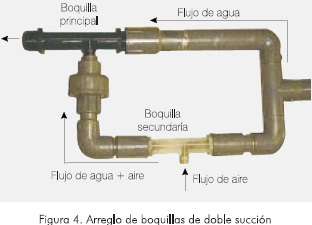 El arreglo de doble succión es un conjunto de dos boquillas que operan en paralelo para el fluido motriz (agua) y en serie para el fluido inyectado (aire). En la Figura 4 se muestra este arreglo.