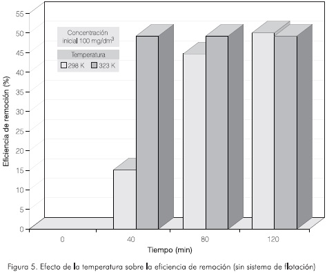 En la Figura 5 se observa que la remoción de hidrocarburo a una alta temperatura (323 K) se da prácticamente en los primeros cuarenta minutos y luego no hay remoción. A baja temperatura (298 K), la remoción ocurre lentamente y sólo a los 120 minutos iguala el porcentaje removido a 323 K. Esto es lógico pues la temperatura hace que la diferencia de densidades entre el crudo y el agua aumente, favoreciendo la separación.