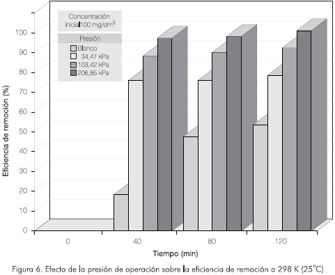 Se observa que a mayor presión la remoción aumenta. En la operación a baja presión se obtiene baja generación de microburbujas, mientras que a presiones altas se obtiene una buena cantidad de micro-burbujas. Sin embargo, el rango de presión no debe excederse porque se puede presentar turbulencia y promover reemulsión del crudo disminuyendo la remoción. En operación industrial, la presencia de un desnatador puede evitar este efecto.