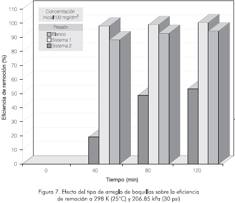 La comparación de la utilización de diferentes arreglos de boquillas (Sistemas 1 y 2) para la generación de burbujas se presenta en la Figura 7, allí se observa que el Sistema 1 (menor flujo), presenta mejor funcionamiento para el proceso de flotación. Para el caso del Sistema 2 (mayor flujo), se provocan efectos turbulentos en la celda, que afectan la remoción por inestabilidad del sobrenadante.