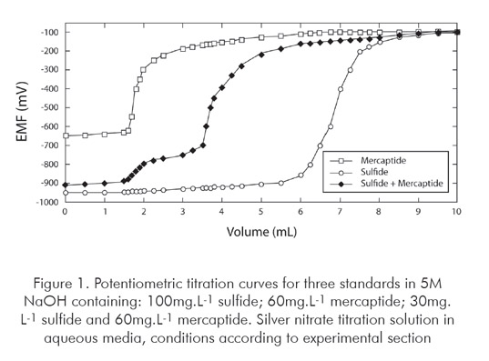 When only sulfide is present, the inflexion begins at about 950 mV; if only mercaptide is present in solution, the voltage begins to change around 650 mV. If both sulfide and mercaptide are present, the behaviour remains quite similar in terms of beginning and ending of curve inflexion, and hence two inflections will be noted in titration curve. The first one is related to the presence of sulfide ions while the second one to mercaptide ions. If none species is present, the measured voltage difference at the beginning of titration is near 200 mV and remains at this range until the end of titration.