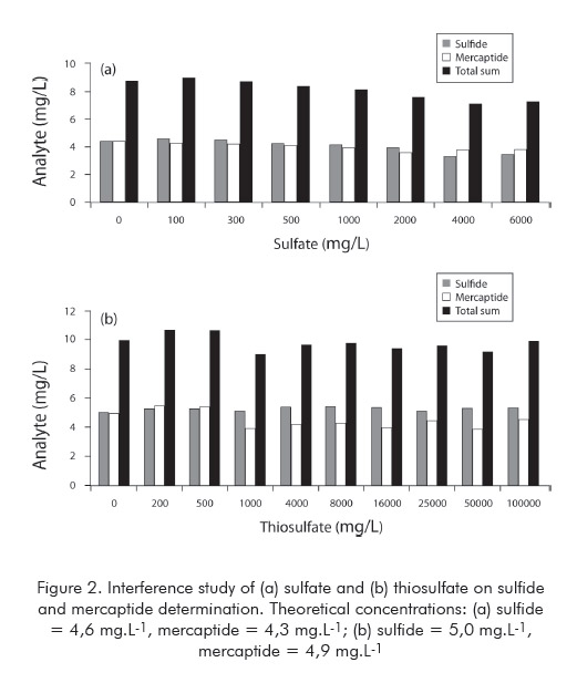 Neither sulfate nor thiosulfate showed a significative interference effect. Above 2 000 mg.L-1 of sulfate the sum of both analytes showed a slight drop from the theoretical value. However, this corresponds to a concentration decrease of less than 10% for each analyte. The presence of thiosulfate caused a discreet change in the distribution between sulfide and mercaptide above 500 mg.L-1, although the sum of the analytes remained steady over the thiosulfate concentration range. The effect on mercaptide results due to higher thiosulfate concentrations is statistically significative since it is above the observed repeatability of the proposed method (ca. 0,7 mg L-1S2- and RS- for the concentration level used in this study section). However, even this effect do not represent a relevant impact on the analytical results in practical terms.