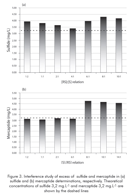 The results demonstrated there is no marked influence of mercaptide excess on the sulfide determination in the tested range. On the other hand, the presence of excess of sulfide to mercaptide, in a ratio equal or greater than eight, causes a significative increase on the mercaptide results. The UOP method mentions such an interference, although it states this effect is observed only if the ratio of sulfide to mercaptide is greater than 10. These conclusions are in accordance with the repeatability values observed in the concentration level used in this study (ca. 0,6 mg L-1S2- and RS- ).