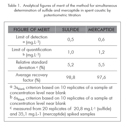 However, limited information is available on the literature regarding interferents in the analysis and the suitability of the method to an effluent originated from new units based on more modern technologies. In fact, the more relevant papers on this subject date from the 50´s and 60´s. Tamele et al. (1960) suggested most of species normally encountered in petroleum processing did not interfere. Certain anions such as iodide, bromide, and cyanide interfere by forming very insoluble silver salts, but they are not expected to be present in the spent caustic samples. Some strongly reducing species also interfere by reducing the silver titrant to metalic silver; this interference is evidenced by a rapid darkening of the solution and formation of a silver mirror on the walls of the titration beaker. Karchmer (1957) also pointed out possible interference caused by inorganic polysulfides (RSS)- whose formation during titration is related to the presence of elemental sulfur and certain mercaptan species. However, Karchmer (1958) also suggests elemental sulfur is unlikely to be present in aqueous samples.