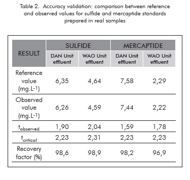 The method was validated following well established statistical procedures. The figures of merit of the validated method are summarized in Table 1. Accuracy was evaluated comparing the observed results of a standard to the theoretical ones through t-test. Each standard was prepared using samples taken from WAO and DAN units, after acidification and purging until complete removal of the analytes, which was confirmed by analysis. The average of ten replicates was compared to the reference value for each analyte as shown in Table 2. Since the tobserved values were always below the tcritical values, one cannot reject the null hypothesis the obtained average and reference value come from the same population or, in other words, there is no significative statistical difference between the analytical result and theoretical value.