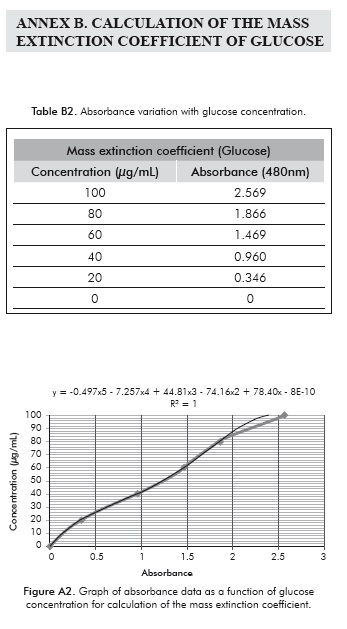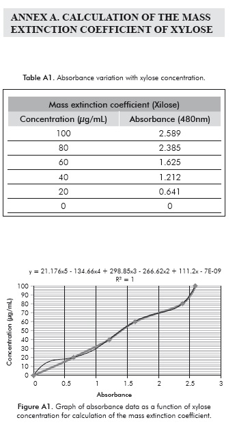 The Phenol-Sulphuric acid colorimetric method (Dubois et al., 1956) was used. This method allows the differentiation of the various types of sugars present in the sample and is more sensitive than methods such as the DNS. A 1 mL sample of each culture was centri-fuged for 20 min at 3400 rpm to separate the biomass from the liquid phase. To avoid a possible interference generated by chlorophylls, pigments were extracted from the separated biomass through the addition of 10 mL of ethanol. The mixture was subsequently heated for 10 min at 25°C in a water bath and centrifuged again for 20 min at 3400 rpm. Two phases were obtained after centrifugation, the liquid phase corresponding to the extracted pigments and the pigment-free biomass pellet. To avoid the color of the pigments altering the measurements, 0.3 g of activated carbon were added to the liquid phase, then shaken for a few seconds and filtered. Subsequently, 1 mL of 5% phenol solution and 5 mL of 95.5% sulphuric acid were added to each phase. Finally, each of these samples was transferred to the colorimetric cells. Absorbance at 480 nm was measured for identification of xylose and 490 nm for identification of glucose, in a Spectroquant Pharo 300 spectrophotometer (Merck®). The spectrophotometric absorbance was converted to carbohydrate concentration using a calibration curve established for xylose and glucose respectively (Annexes A and B).