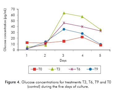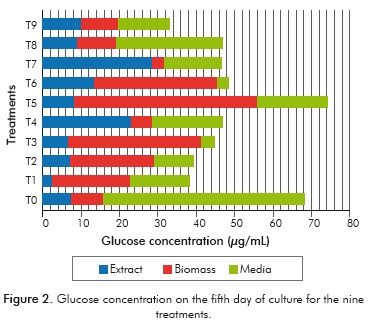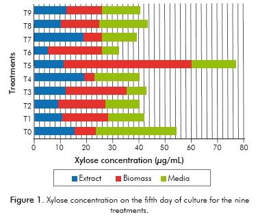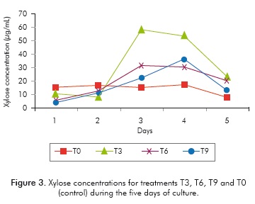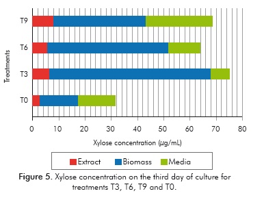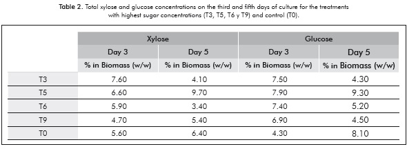 Table 2 shows a comparison between the treatments with the highest concentration of sugars (T3, T5, T6 and T9) and the control (T0). It can be observed that on the third day of culture, the amounts of xylose and glucose range between 46-78.9 and 62.2-77.2 μg/ mL respectively, exceeding the values obtained by the control (40.2 μg/mL of xylose and 31.3 μg/mL of glucose). Similarly, the percentages of total xylose and glucose produced in regard to biomass quantities were quantified. It was found that on the third day, these percentages ranged from 4.3 to 5.6% in the control, and on the fifth day they were between 6.4 and 8.1%, while for the evaluated treatments they were between 4.7 and 7.9% on the third day and 3.4 and 9.7% on the fifth day.