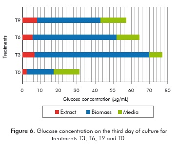 Although in the different treatments the reached xylose and glucose concentrations during five days of culture are significant, it is also possible to obtain similar (or higher) values of carbohydrates on the pigments-free biomass after three days of culture (Figures 3, 4 and 5). This phenomenon occurred only in treatments T3, T6 and T9, which have the highest concentration of sodium acetate (20 mM) in comparison with the other treatments. Form this treatments the highest concentrations were found in T3 (20 mM sodium acetate, 0. 97 mM sodium nitrate), with values for xylose of 58.3 μg/ mL in the biomass after pigments extraction, 6.49 μg/ mL on the pigments extract and 14.1 μg/mL in the culture media for a total of 78.95 μg/mL of xylose; in the case of glucose it was found values of 63.32, 6.75 and 7.13 μg/mL obtained from the biomass after pigment extraction, on the pigments extract and culture media, respectively, for a total of 77.21 μg/mL of glucose (Figures 5 and 6).