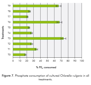 Results shown that the amount of sodium acetate is directly proportional with phosphate consumption to each of the treatments (Figure 7). In addition, statistical analysis shows significant differences in phosphate consumption and among the different treatments (F: 213.6, p: 0.00), however there is no relation between the phosphate rate consumption and biomass concentration. The treatment with the highest phosphate consumption in the culture media (76%), highest biomass concentration (1.04 g/L) and highest carbohydrate concentration (xylose 0.6 g/L and glucose 0.06 g/L) was T3, followed by T6, with a phosphate consumption of 67% and bio-mass, xylose and glucose concentration was 0.86 g/L, 0.03 g/L and 0.05 g/L, respectively, and finally, T9, consumed 66% phosphate with a concentration of 1 g/L of biomass, 0.02 g/L of xylose and 0.04 g/L of glucose.
