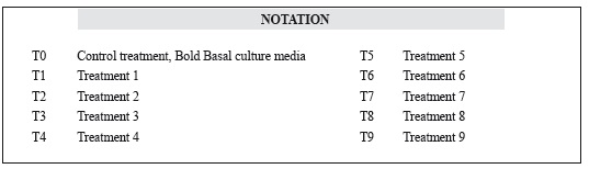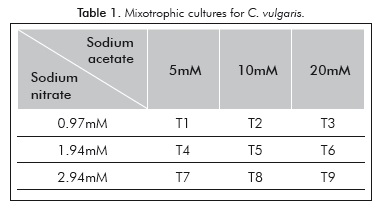 Sodium acetate and sodium nitrate concentrations in mixotrophic cultures were varied (Table 1) based on the results obtained by Hernández-Benitez and Rosas-Oviedo (2011). Each of the experiments (including the control) was inoculated with approximately 0.4 g/L (in dry weight) of fresh biomass and performed in triplicate for 5 days under light:dark cylces of 12:12 hours The cultures were mixed using filtered air (0.2 mi membrane filter) flow of 0.6 L/min without any additional C02 supply. Initial pH, temperature and light intensity were 7 ± 1, 23 ± 2°C y 480 ± 1 (miol photons/m2/s.
