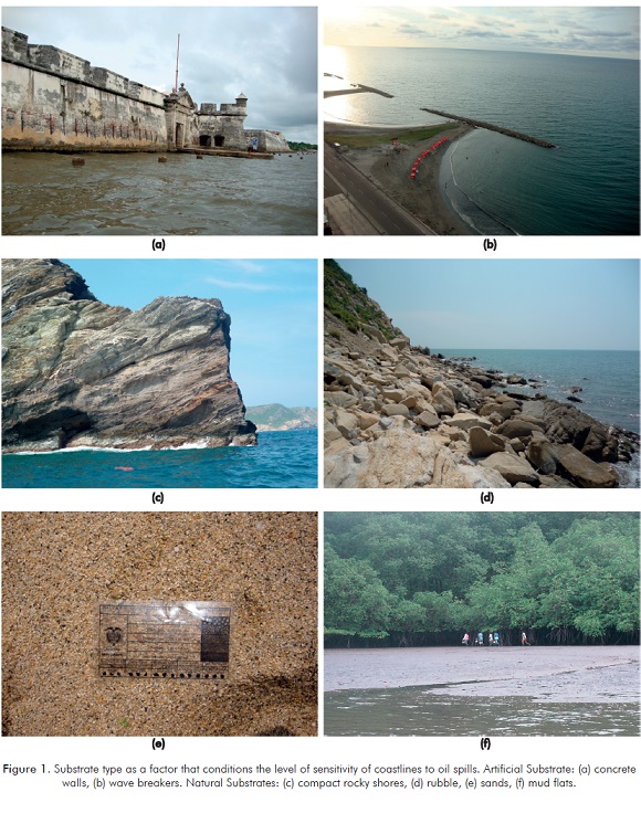 The degree of sensitivity is mainly determined by the characteristics of the substrates found on the coastline (Figures 1c-1f). The relation between grain size and sensitivity is given by the possibility and depth of oil penetration into the substrate, the potential for burial, and the time that the oil will remain in contact with the substrate and biota, which determines the kind of cleaning technique required; grain size also determines the biodiversity present in the coastline. Coastlines with consolidated compact rocks and beaches with fine compacted sand that prevent oil to percolate into the substratum are considered to be less sensitive than beaches of gravel or coarse sand where oil can easily penetrate (Gundlach & Hayes, 1978; Petersen et al., 2002).