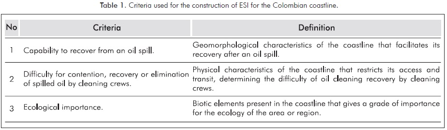 In order to construct an ESI for Colombia, two workshops were conducted with national and international experts (including experts in oil spill contingency planning, government organizations and academia). During the first workshop, discussions revolved around the different factors and criteria to be taken into account in order to establish such an index, bearing in mind that geomorphologic, hydrodynamic, and biotic characteristics of the coast line are the main determinants of oil behavior and, for instance, the degree of environmental impact they can cause (Gundlach & Hayes, 1978; Petersen et al., 2002; SQA/MMA, 2004).